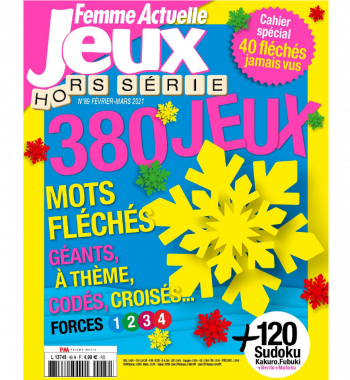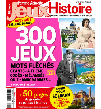 Femme Actuelle Jeux Histoire paraît tous les deux mois et est composé de 1116 pages, dont les 2/3 sont des jeux et 1/3 de la lecture. Vous y trouverez 300 jeux dont des mots fléchés, codés, géants, à thème, anagrammes, mélangés, croisés… de force 1 à 4 et de tailles différentes, ainsi qu’un nouveau jeu : les fléchés mystère.