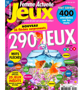 Femme actuelle Jeux rassemble 2 millions de lecteurs chaque mois autour de 116 pages de jeux (fléchés, codés, mélangés, croisés, anagrammes, sudokus…) et d’anecdotes insolites sur l’histoire des mots et une multitude d’informations surprenantes sur la culture générale. Ce mensuel féminin, joyeux et riche, a une double vertu : il amuse et cultive !