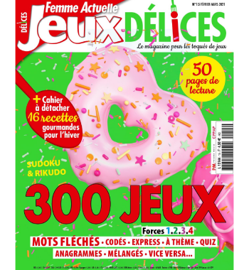 Femme Actuelle Jeux Délices paraît tous les 2 mois et compte 116 pages dont les 2/3 sont des jeux et 1/3 des pages lecture.